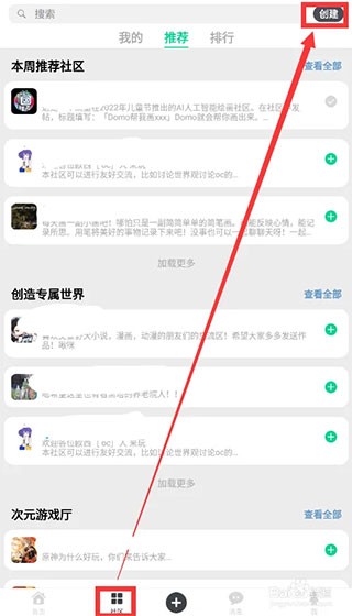 1、进入DomoAI绘画的“社区”,点击右上角“创建”。